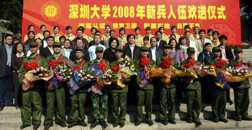 12月10日上午,我校舉行了深圳大學2008年入伍學生座談會及新兵入伍歡送儀式。校黨委副書記陶一桃、副校長李永華,校武裝部、學生處及入伍同學所在學院領導出席了座談會和歡送儀式。 座談會在辦公樓201會議室舉行。學校邀請了新兵同學的家長及今年剛退伍的同學參加了會議。校武裝部部長楊平首先介紹了今年深圳大學征兵工作的情況。我校今年共有83名同學報名應征,46人(其中5名女生)參加...