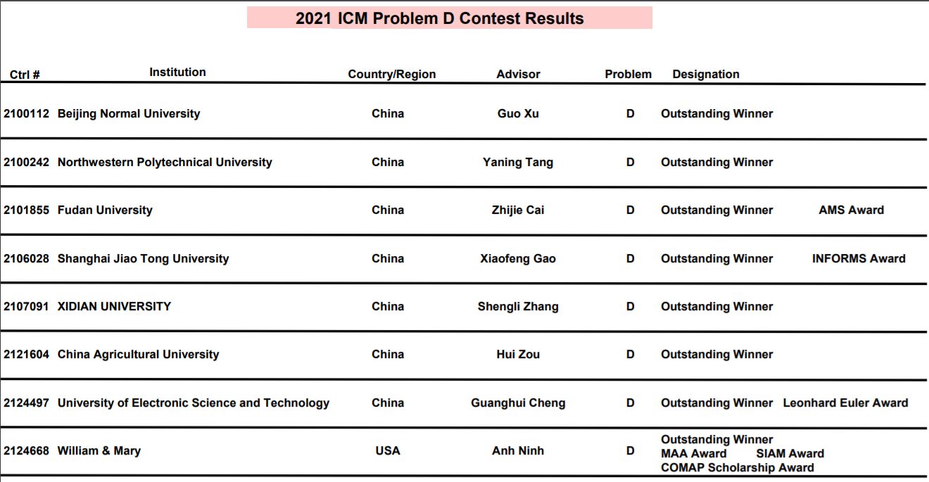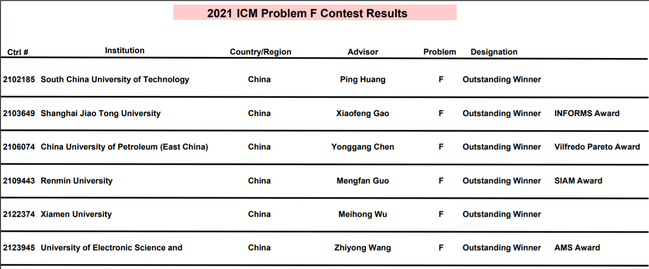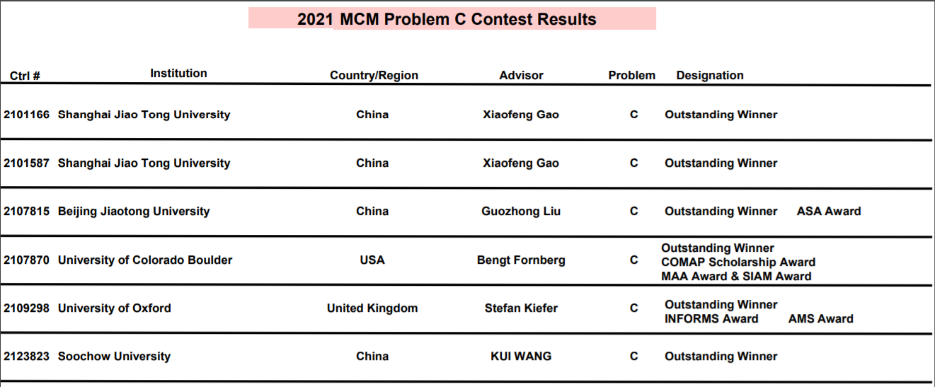 附:2021年美賽獲獎數(shù)據(jù)(引用自美賽官網(wǎng):https://www.comap.com/undergraduate/contests/mcm/contests/2021/results/