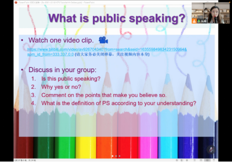 外國語學(xué)院陳曦老師在《英語演講:思辨與表達(dá)》課堂中,以演講視頻為依托就“演講的含義”展開了小組討論,并全班隨機(jī)問答,通過影像、聲音和文字多種形式的互動(dòng)達(dá)到了良好的課堂效果。