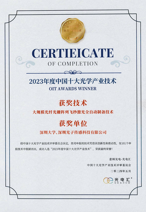 5月18日舉行的2023年度中國十大光學產業技術頒獎典禮暨產業創新大會上,深圳大學王義平教授團隊和深圳光子傳感科技有限公司聯合研發的“大規模光纖光柵陣列飛秒激光全自動制備技術”從101個申報項目中脫穎而出,榮膺2023年度中國十大光學產業技術獎。