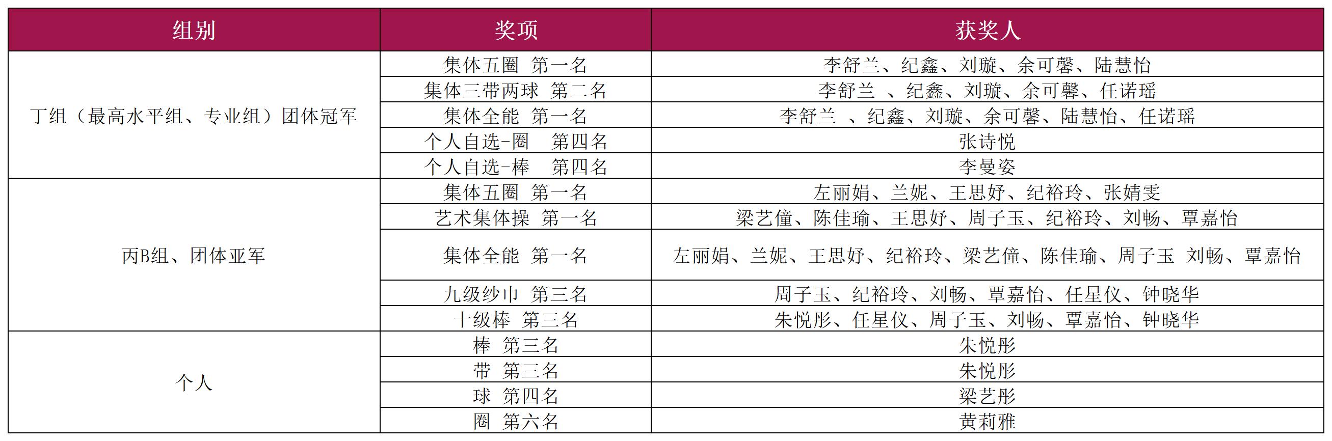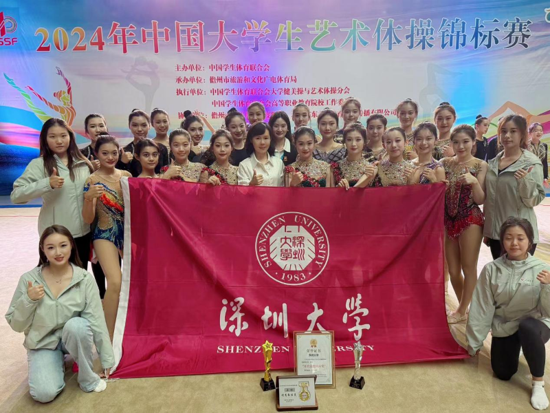 2024年11月17日,中國大學生藝術體操錦標賽在海南省儋州市的海花島舉行。來自北京大學、清華大學、浙江大學、北京體育大學、上海體育大學等40支代表隊的近400余名運動員參賽,是參與人數最多,水平最高的大學生藝術體操賽事。深圳大學共派出26名運動訓練專業學生,參加丙B、丁組(最高水平組、專業組)經過5天激烈的角逐,獲得5金1銀4銅,包攬兩個組別的集體全能冠軍,獲得丁組團體冠軍和丙B組團體亞軍。深圳大學獲得體育道德風尚獎,主教練姜詠老師獲得優秀教練員稱號。