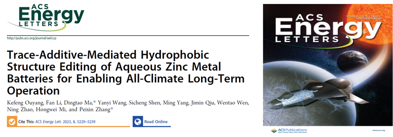 4.為解決Zn2+傳輸動力學緩慢和電解質界面熱力學不穩定等問題,提出了痕量添加劑介導的疏水結構編輯概念,通過向水系電解液中添加聚丙烯酸(PAA)來重建電解液Zn2+溶劑化結構并實現電極-電解液界面原位自組裝。重構的Zn2+水合結構具有快速的電化學反應動力學,而電極表面界面層極大提高了水系鋅金屬電池體系的熱力學穩定性,從而實現了寬溫域的長期運行。該成果作為封面文章發表在《ACS Energy Letters 》(2023,8:5229)。深圳大學為第一完成單位和唯一通訊單位,研究生歐陽珂豐和李帆為論文第一作者,張培新教授和馬定濤副研究員為共同通訊作者。論文鏈接:http://10.1021/acsenergylett.3c01872