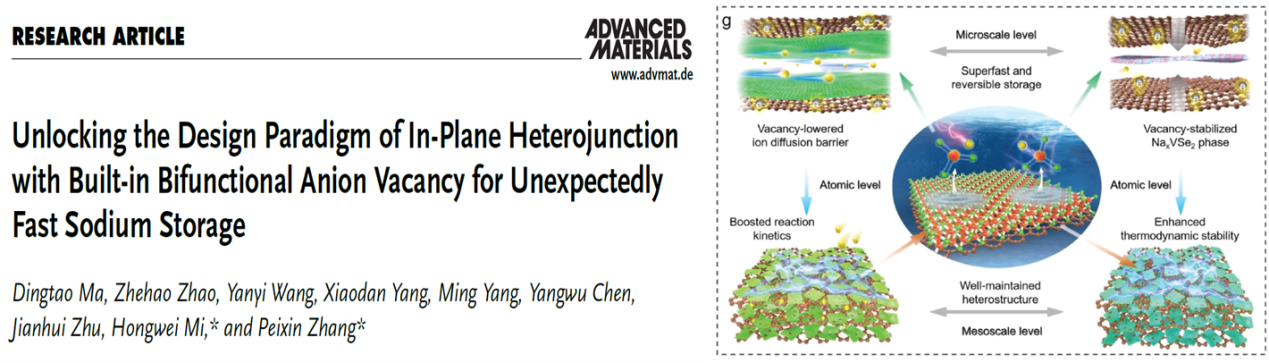 1.為解決過渡金屬化合物作為鈉離子電池負極材料容量低和循環性能差等問題,提出了一種獨特的原位功能化和自限生長方法,以V2CTxMXene為模板,設計了具有內嵌陰離子空位的VSe2-x/C面內異質結,在加硒過程中,V2CTx的碳原子層轉化為超薄的導電碳,最大限度地與生成的VSe2組分面對面接觸。同時,碳還原環境的自發形成削弱了V-Se鍵,產生了豐富的Se陰離子空位結構,雙功能陰離子空位與面內異質結構之間存在多尺度的界面協同作用,緩解了體積應變,提高了Na+插層和后續轉化反應的動力學和熱力學。該成果發表在《Advanced Materials》(2023:2310336),深圳大學為第一完成單位和唯一通訊單位,馬定濤副研究員和研究生趙哲浩為論文共同第一作者,張培新教授和米宏偉副教授為共同通訊作者。論文鏈接:https://doi:10.1002/adma.202310336