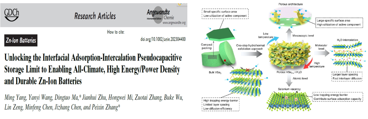 2.為解決用于鋅離子存儲的過渡金屬硫族化合物(TMDs) 存儲動力學緩慢和性能差等問題,提出了一種多尺度界面結構集成調制概念,以解鎖全方位存儲動力學增強的多孔VSe2-x·nH2O宿主,同時還發現了一種界面吸附-插層贗電容存儲機制。這項工作實現了概念上的突破,擴展了層狀TMDs的界面存儲極限,以構建全天候高性能鋅離子電池。該成果發表在《Angewandte Chemie International Edition》(2023,62:e202304400)。深圳大學為第一完成單位和唯一通訊單位,博士研究生楊明為論文第一作者,張培新教授和馬定濤副研究員為共同通訊作者。論文鏈接:https://doi.org/10.1002 / anie.202304400