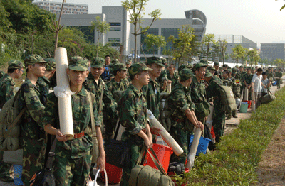 今年我校6000多名本科新生將分赴廣州國防園、廣州武警指揮學院、梅林防化團進行為期15天的軍訓。13日上午,新生們在領隊的帶領下,身著迷彩整裝待發。他們面帶微笑,英姿煥發,對未來半個月軍訓生活充滿信心和期待。上午9:30分左右,車隊從學校南門出發,數百輛50座巴士在寬闊的白石路上擺起長龍,浩浩蕩蕩開往軍訓基地。為保障學生們的安全健康和正常訓練,同去的還有校醫院醫生。而且,每支隊伍都安排了特定的輔導員,照顧同學們的生活起居。