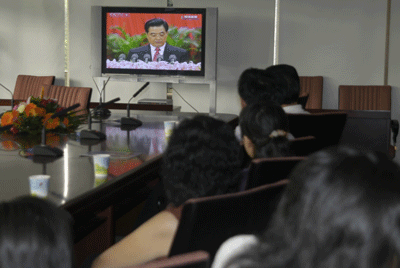 9:00,辦公樓201會議室,機關干部和師生代表集中收看了黨的十七大開幕會電視現(xiàn)場直播,校黨委副書記、紀委書記陶士平與師生代表一起觀看。