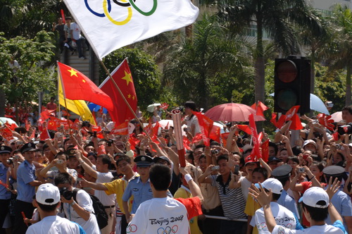 幾個化學與化工學院的大學生表示被現場的熱烈氣氛所震撼。盡管天氣很熱,但她們心中充滿驕傲和喜悅。她們都感到異常激動,表示一定要堅持到底,為中國和奧運加油。