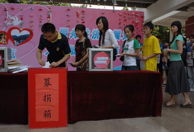 在活動現場,校團委副書記方琳代表校團委感謝并肯定同學們為援助災區的行動;校學生會主席潘暢同學宣讀了致四川省學聯和受災地區大學生的慰問信;校義工聯向全校師生發出了捐款捐物的倡議。