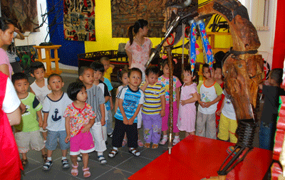 小朋友們對3號藝棧藝術(shù)家工作室里展出的繪畫、雕塑、軟硬藝術(shù)及書法等作品充滿好奇心,時不時指指點點,煞是可愛。在解說員叔叔阿姨的講解下,小朋友們對藝術(shù)作品有了初步的了解,感受了藝術(shù)美,增強了對藝術(shù)的向往。