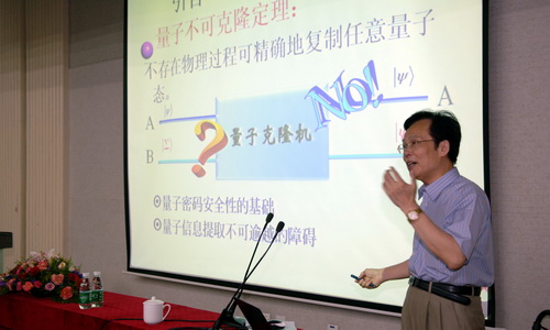 郭光燦主要從“什么是量子信息”,“量子計(jì)算的研究狀況”以及“量子密碼的最新進(jìn)展”等幾個(gè)方面進(jìn)行介紹。他說(shuō),支配著電子計(jì)算機(jī)每十八個(gè)月翻一番的莫爾定律必將失效,而量子信息技術(shù)可以突破現(xiàn)有信息技術(shù)的物理極限,為信息科學(xué)的發(fā)展提供新的原理和方法。量子信息是量子物理與信息科學(xué)相融合的新興交叉學(xué)科,基于量子力學(xué)的特性,如疊加性、糾纏性、非局域性和不可克隆性等,量子信息可以突破現(xiàn)代信息技術(shù)的物理極限,開拓出新的信息功能,量子密碼可以提供不可竊聽、不可破譯的絕對(duì)保密通信,量子計(jì)算具有巨大的并行計(jì)算能力,提供功能更強(qiáng)的新型運(yùn)算模式。量子信息技術(shù)有望以嶄新原理和方法開拓后莫爾時(shí)代的新一代信息技術(shù)。