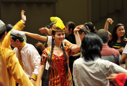 新疆師范大學(xué)民族樂團(tuán)演奏的《塔西瓦依》、《阿娜爾汗》、《吾夏克木卡姆》、《我的熱瓦普》等樂曲反映出數(shù)百年來維吾爾族的歷史文化與社會(huì)生活,明快的曲調(diào)直抒胸臆、壯美綺麗。具有濃郁傳統(tǒng)氣息的《納瓦木卡姆》歌舞片斷,熱烈歡愉,在演員們的盛情邀請下,不少深大師生上臺(tái)與他們一起載歌載舞,體會(huì)新疆民族文化的獨(dú)特魅力。