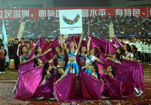 入場式的最后,由200名深圳大學大運會志愿者組成的方陣精彩亮相。他們身著印有大運會標志的T恤,以整齊劃一的步伐,陽光、健康的精神風貌步入會場,把會場氣氛推向高潮,全場爆發出陣陣熱烈掌聲和歡呼。
