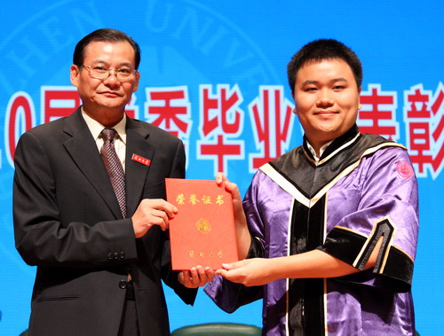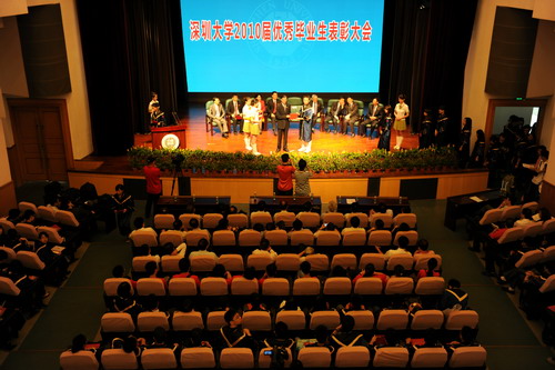 荔園七月,碩果滿枝,深圳大學有了自己的博士畢業生!7月1日上午,深圳大學2010屆優秀畢業生表彰大會在國際會議廳舉行。光學工程專業秦琬、信號與信息處理專業李鵬飛兩位博士畢業生和361名優秀畢業生一起從校黨委書記江潭瑜手中接過證書,聆聽校長章必功的畢業致辭,在畢業前夕受到學校的隆重表彰。校領導邢苗、陶士平、陶一桃、阮雙琛、邢鋒、李鳳亮和各學院、研究生部、各機關部處室負責人,教師代表,2010屆優秀本科畢業生和優秀畢業研究生以及部分家長參加典禮。儀式由副校長邢鋒主持。