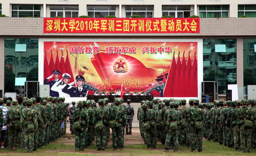 此次軍訓(xùn)從9月12日到9月21日,歷時(shí)10天。全校新生分成三個團(tuán),各團(tuán)設(shè)政委一名,副政委兩到三名。軍訓(xùn)一團(tuán)設(shè)于廣州陸軍預(yù)備役高炮師教導(dǎo)大隊(duì),由來自法學(xué)院、電子科學(xué)與技術(shù)學(xué)院、經(jīng)濟(jì)學(xué)院、計(jì)算機(jī)與軟件學(xué)院、外國語學(xué)院、傳播學(xué)院、文學(xué)院、光電工程學(xué)院,共2724名學(xué)生組成;軍訓(xùn)二團(tuán)設(shè)在葵涌預(yù)備役五團(tuán),有機(jī)電與控制工程學(xué)院、土木工程學(xué)院、材料學(xué)院、高爾夫?qū)W院、管理學(xué)院、師范學(xué)院、生命科學(xué)學(xué)院的2075名新生;軍訓(xùn)三團(tuán)在梅林預(yù)備役防化團(tuán),由1280名新生組成,他們來自化學(xué)與化工學(xué)院、數(shù)學(xué)與計(jì)算科學(xué)學(xué)院、藝術(shù)與設(shè)計(jì)學(xué)院、信息工程學(xué)院、醫(yī)學(xué)院、物理科學(xué)與技術(shù)學(xué)院、建筑與城市規(guī)劃學(xué)院。