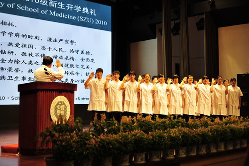 新生代表受佩校徽、由鐘南山院士親手授白袍,并且舉行了莊嚴的新生宣誓儀式。