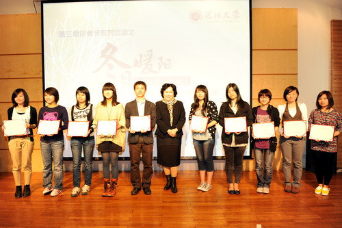 陶一桃為陳勇等十名同學頒發了“十佳記者”的榮譽證書。高福生、沈清華為鐘詩婷等十多名同學頒發了“十佳新聞作品”榮譽證書。