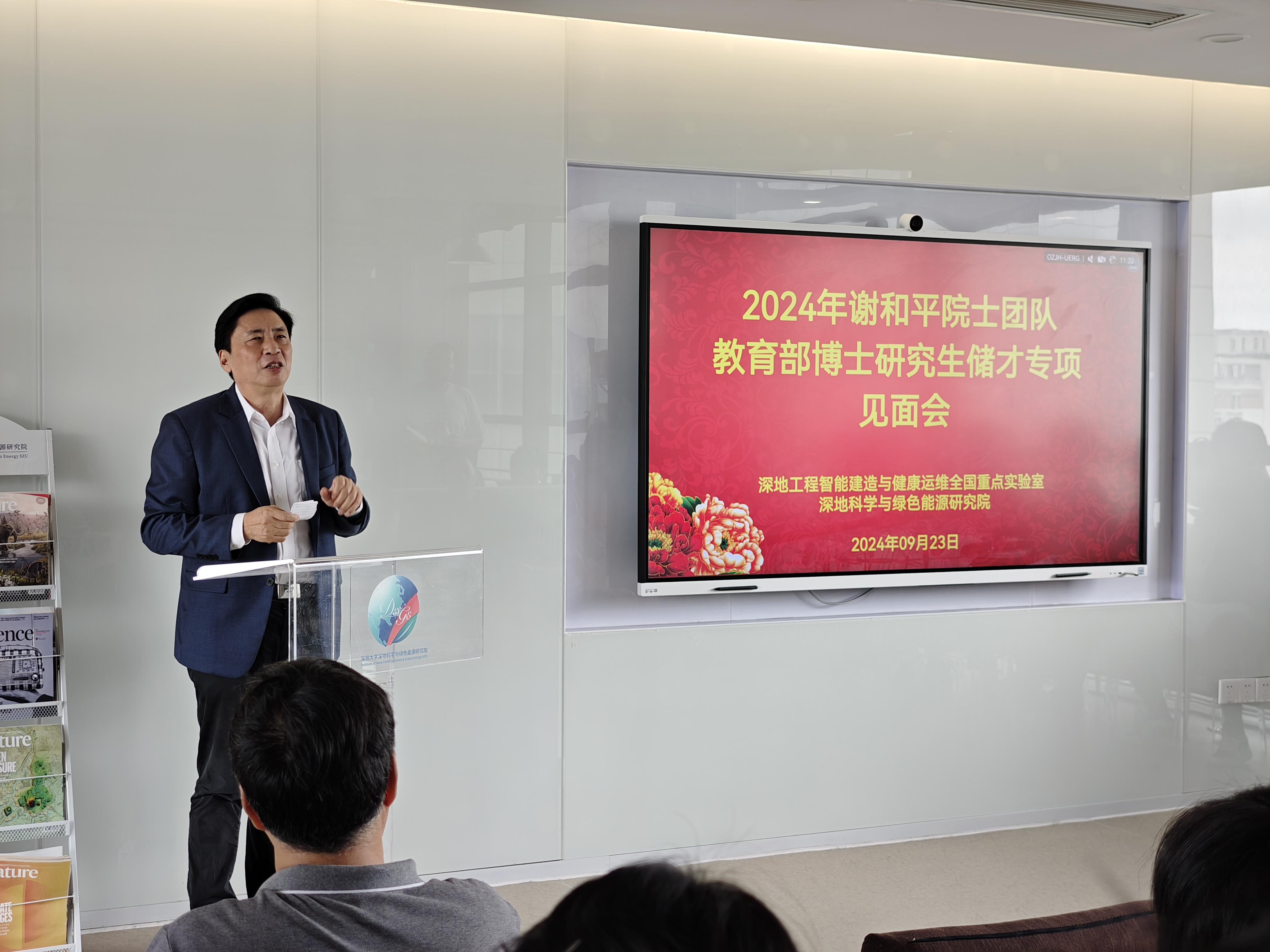2024年9月23日上午,深圳大學謝和平院士團隊2024級教育部博士研究生儲才專項新生見面會在深地科學與綠色能源研究院成功舉行。本次見面會參會人員為深圳大學化學與環境工程學院、計算機與軟件學院、物理與光電工程學院、土木與交通工程學院以及深地科學與綠色能源研究院的儲才專項合作導師及全體新生。