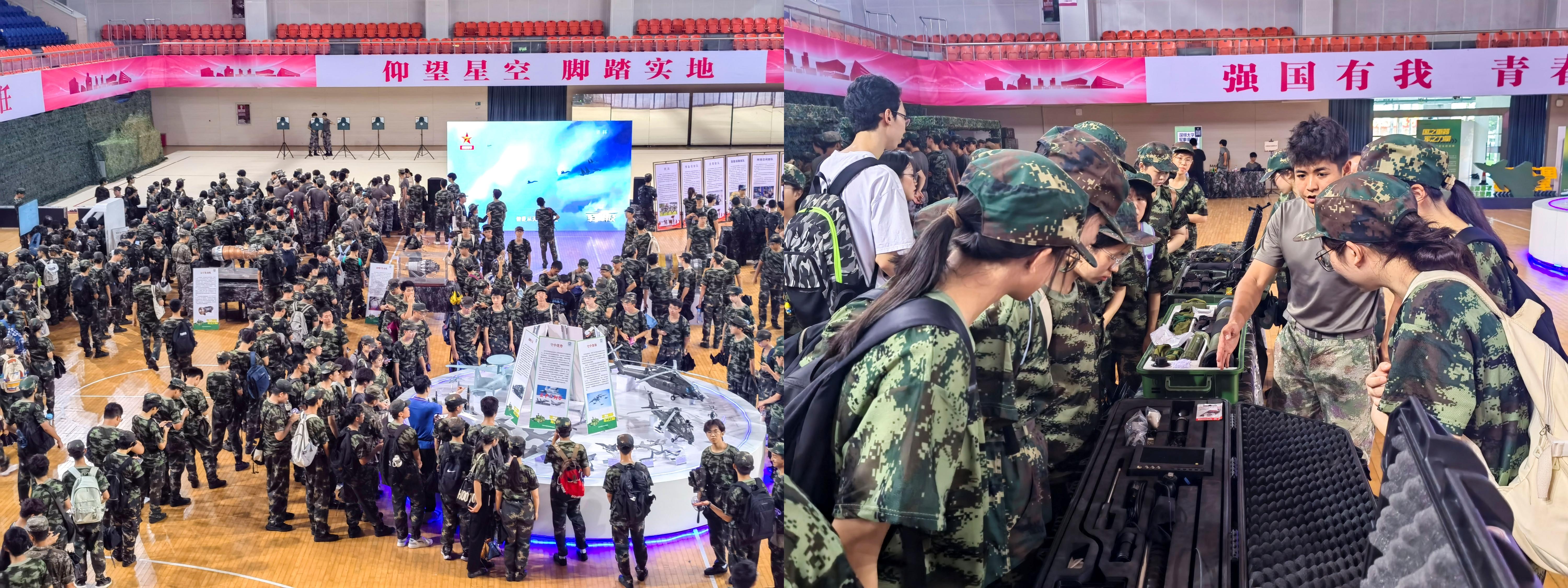 今年軍訓期間,深圳大學首屆“國防文化節”在粵海校區元平體育館開幕。文化節設置無人機展區、航母編隊展區、陸戰編隊展區、航空航天展區、軍用發動機展區、聯合作戰展區、軍事情境展區、單兵裝備展區、模擬飛行體驗、軍事知識展區、模擬射擊體驗、輕武器體驗區和軍事科目表演區共計13個區域,讓師生們通過參觀和體驗,深刻領悟“國之重器、軍之力量”在國家安全與發展中的核心地位。