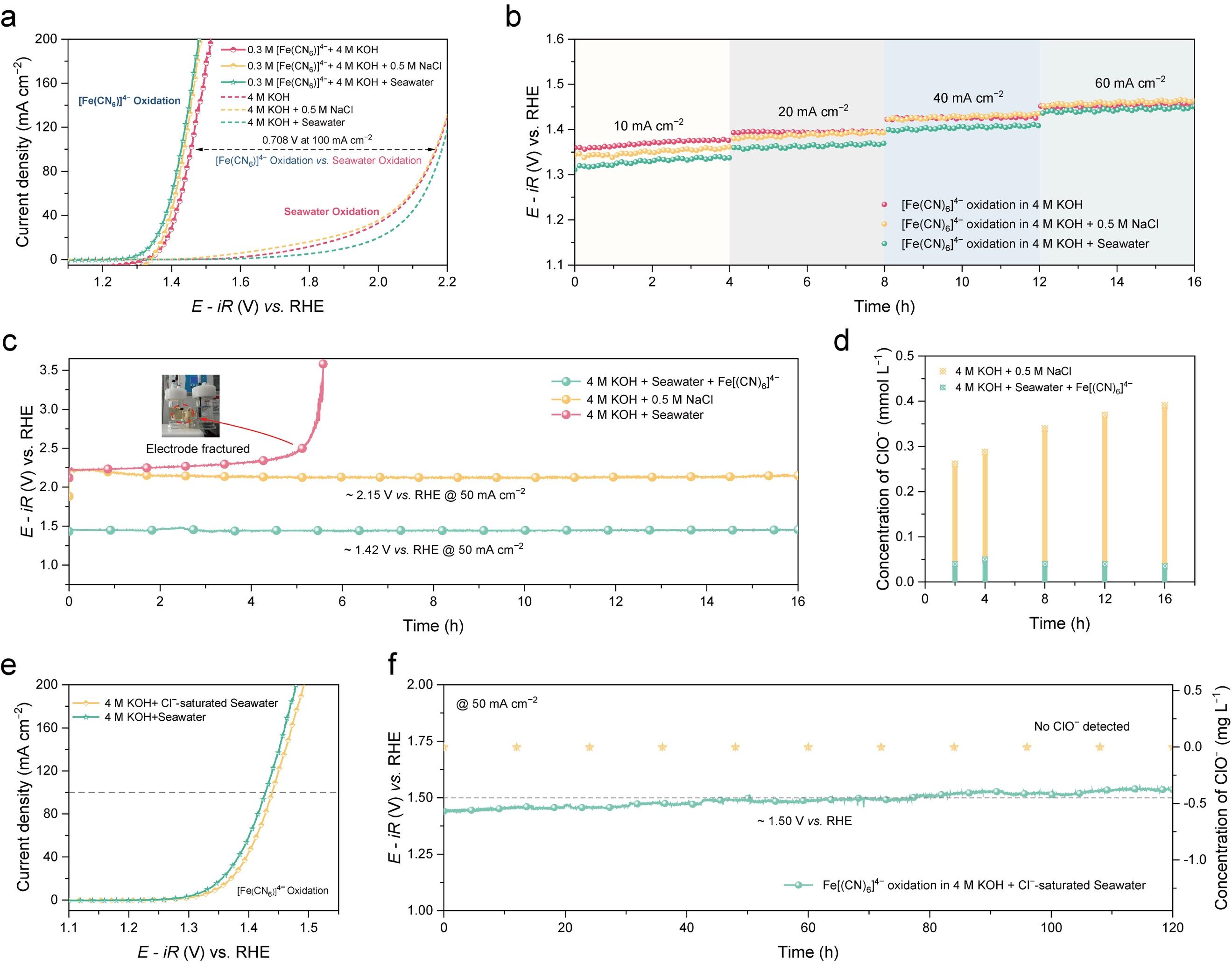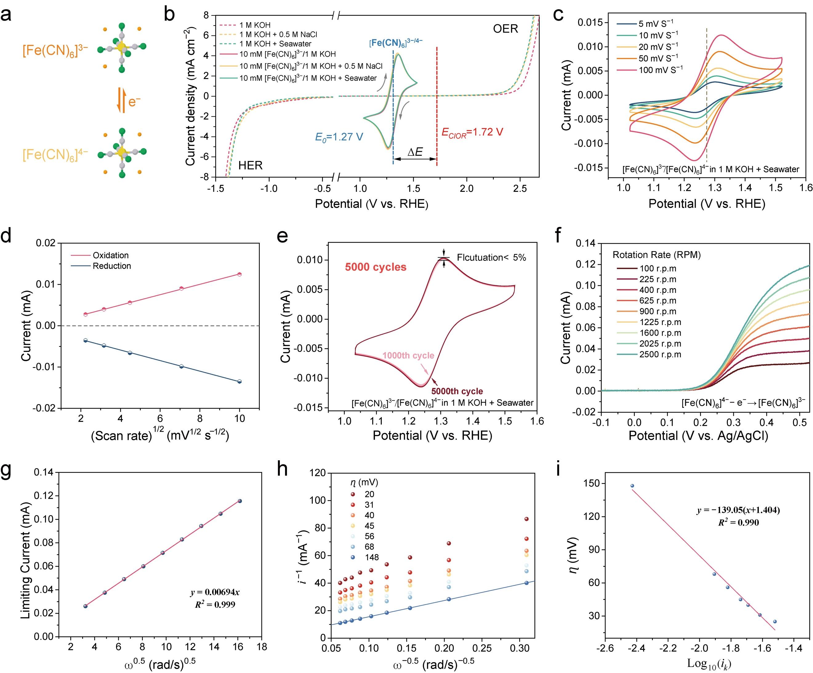 該研究針對海水制氫中最棘手的氯離子干擾難題,引入氧化還原介導的解耦策略,利用兼具熱力學和動力學優(yōu)勢的陽極反應,巧妙規(guī)避了傳統(tǒng)電解水制氫過程中析氧反應與氯離子反應的直接競爭,大幅降低了電化學腐蝕。在該研究中,[Fe(CN)6]3?/4?電對在海水中不僅保持了優(yōu)異的可逆氧化還原動力學特性,而且在200 mA cm?2的接近工業(yè)級電流密度下實現(xiàn)了超過250小時的長時間穩(wěn)定運行。