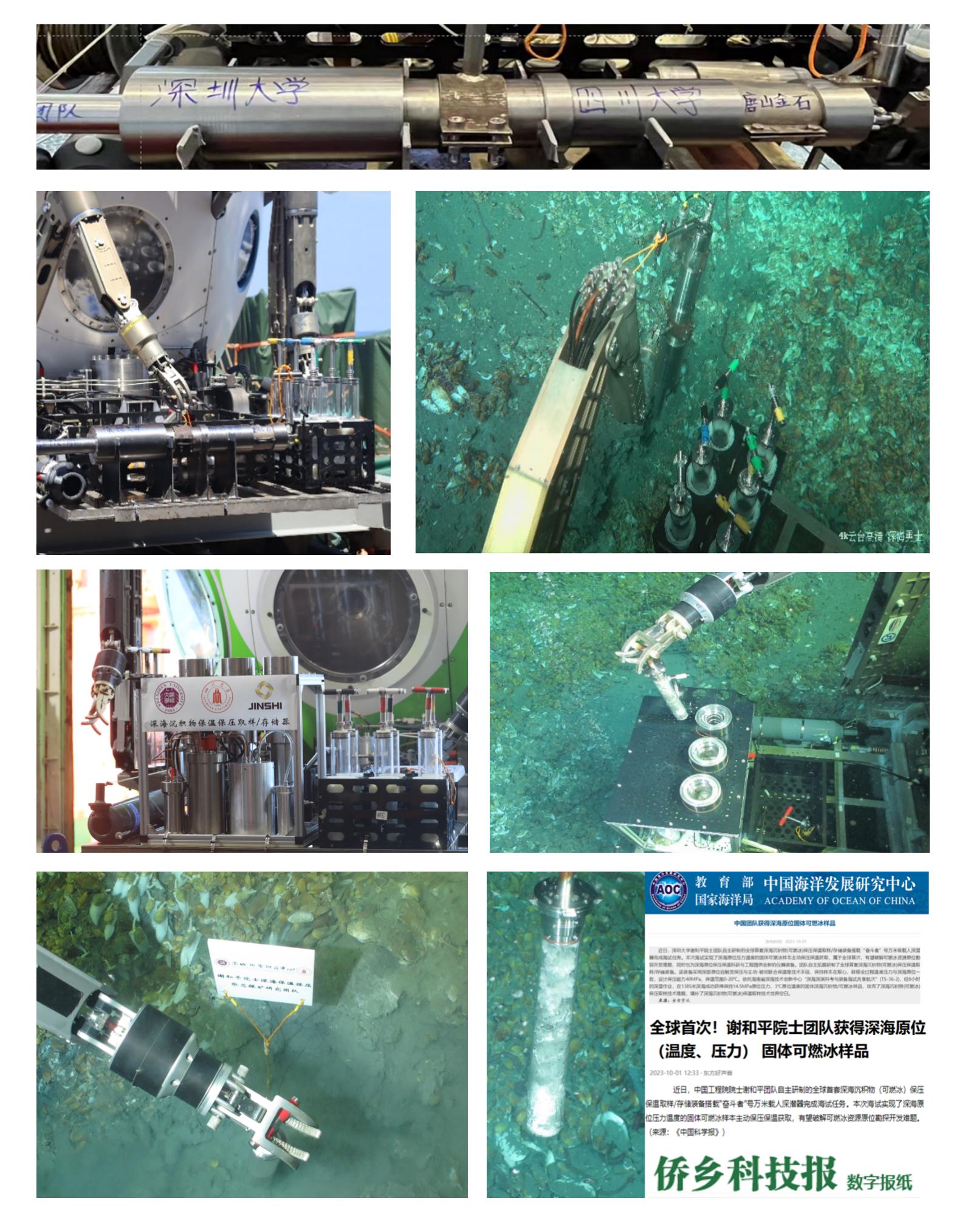 針對深海可燃冰/沉積物原位保壓保溫取芯存儲與樣品物理力學(xué)參數(shù)保真測試的國際難題,謝和平院士團(tuán)隊(duì)創(chuàng)新研制了深海可燃冰/沉積物保壓保溫取芯存儲與測試關(guān)鍵技術(shù)及裝備,自主研制了全球首套基于深潛器與鉆井平臺的深海保壓保溫取芯與存儲技術(shù)裝備,實(shí)現(xiàn)了深海原位壓力溫度的固體可燃冰樣本主動保壓保溫獲取全球零的突破。2022年9月23日,搭載探索二號科考船4500米級“深海勇士”號深潛器,在南海海馬冷泉1370米水深區(qū)域完成多點(diǎn)位保壓保溫取樣作業(yè),在國際上首次獲得保持原位壓力13.8MPa、溫度6.51℃的深海可燃冰樣品。2023年9月27日,搭載探索一號科考船萬米級“奮斗者”號深潛器,在我國南海海馬冷泉1385m水深區(qū)域,首次獲取了保持14.5MPa原位壓力、3℃原位溫度的固體深海沉積物/可燃冰樣品。中央電視臺、中國科學(xué)報、科學(xué)網(wǎng)、香港商報等多家媒體報道了這一重大成果。同時,應(yīng)用該技術(shù)發(fā)現(xiàn)了深海可燃冰/沉積物中微生物的新種及基因資源,為探索深海生命新奧秘提供新認(rèn)識!