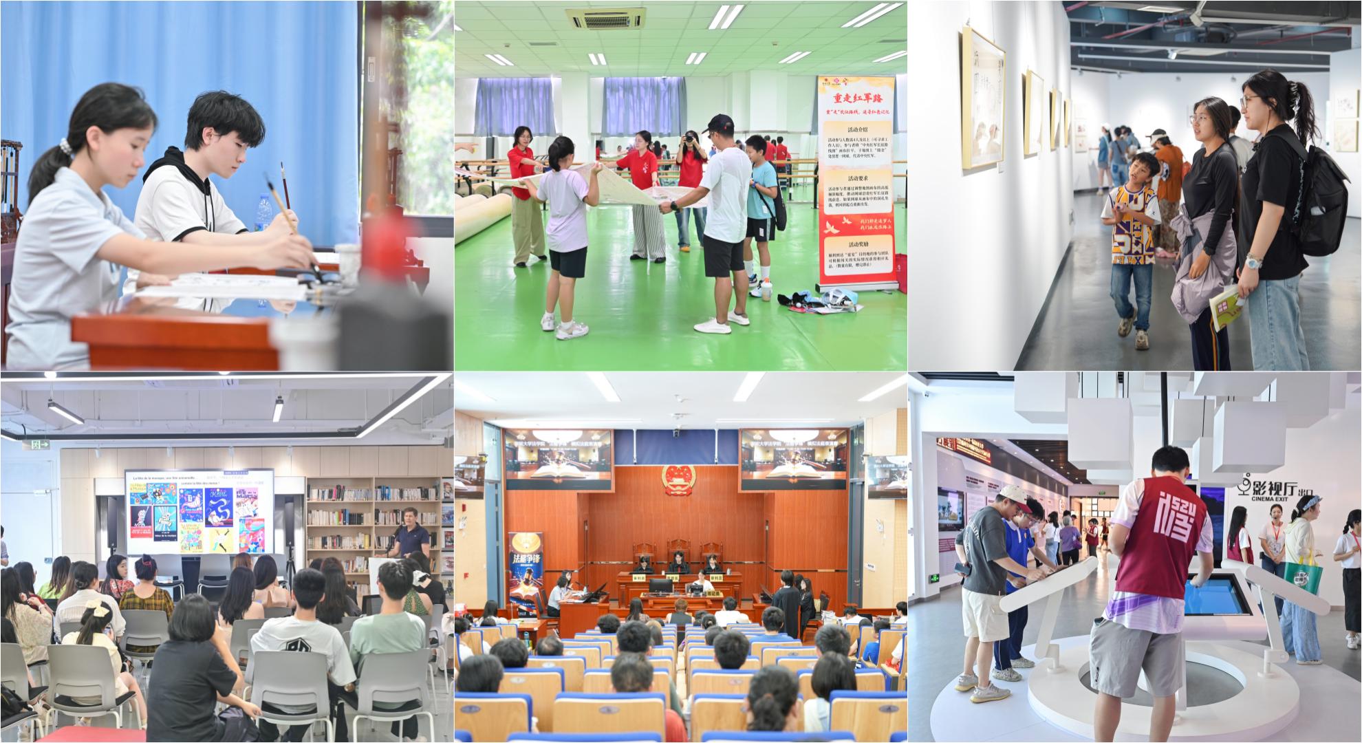 如果你想打卡“創(chuàng)意人文體驗(yàn)”路線——藝術(shù)邨美術(shù)館的“華夏墨韻”,留學(xué)生書畫展墨香四溢,中外文化在此碰撞;傳播學(xué)院“紅色文化小站”,快閃打卡、故事分享,讓紅色基因“活”起來,讓歷史在互動中傳承;鄉(xiāng)村振興調(diào)研成果、社區(qū)治理創(chuàng)新方案,都出現(xiàn)在政府管理學(xué)院的展覽上。在法學(xué)院,一場模擬法庭表演賽正在上演,學(xué)生們化身庭審角色,參觀的市民屏息凝神,沉浸式體驗(yàn)司法審判的全過程。來自深圳外國語中學(xué)的考生黃同學(xué)和家人起了個大早:“我是直奔深大法學(xué)院來的,希望了解法學(xué)專業(yè)的學(xué)習(xí)內(nèi)容。”
