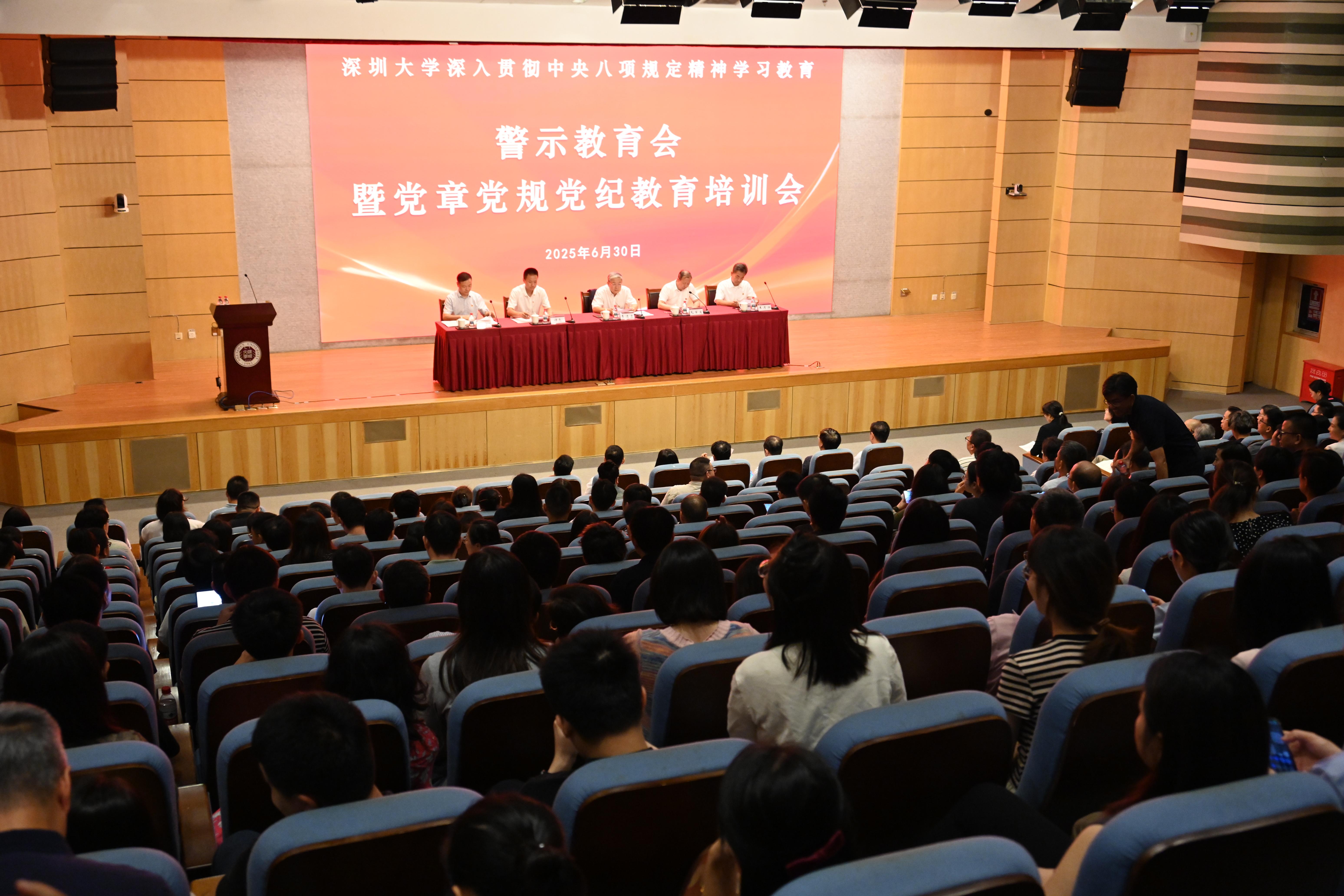6月30日下午,深圳大學在粵海校區匯星樓一號報告廳召開深入貫徹中央八項規定精神學習教育警示教育會暨黨章黨規黨紀教育培訓會。市委第五督導組副組長譚亮一行蒞臨指導,校黨委書記李清泉,校長毛軍發,黨委副書記、紀委書記王月興,黨委副書記吳報水出席會議,全體中層正職領導、新提拔干部、年輕干部及關鍵崗位干部代表參會。毛軍發主持會議。