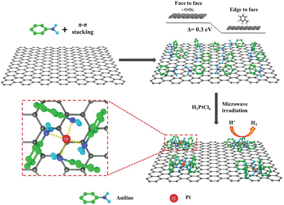 氫能作為一種重要的清潔能源,具有高能量密度、可再生和清潔無污染的優點,在未來綠色新能源開發中占據著極其重要的地位。隨著電能的普及和成本的下降,電解水制氫成為未來最有效的制氫方法。因此,開發高效的HER電催化劑是電解水制氫大規模工業化應用的關鍵。該研究團隊開發了一種新穎簡便的苯胺錨定和微波還原法在石墨烯上負載鉑單原子(Pt SASs/AG)用作析氫催化劑。該方法簡單易行、制備條件溫和,制備過程中無需進行高溫處理,并且不論貴金屬前驅體用量多少,均能專一地形成單原子位點分散在石墨烯表面。同時該方法還利用了石墨烯優異的導電性能,很好地解決了單原子催化劑應用于電催化體系的技術瓶頸。研究發現,Pt SASs/AG具有優異的HER活性,在電流密度為10mA cm-2時過電勢η= 12mV,在η= 50mV時質量電流密度為22400 A g-1Pt,比市售20wt% Pt/C高46倍。 此外,Pt SASs/AG催化劑比Pt/C具有更為優異的穩定性。密度泛函理論(DFT)計算表明原子級分散的Pt位點與苯胺上的N結合優化了Pt的電子結構和氫吸附能,使得Pt單原子表現出優異的HER催化活性。該研究為單原子催化劑的制備和應用研究提供了全新的思路。