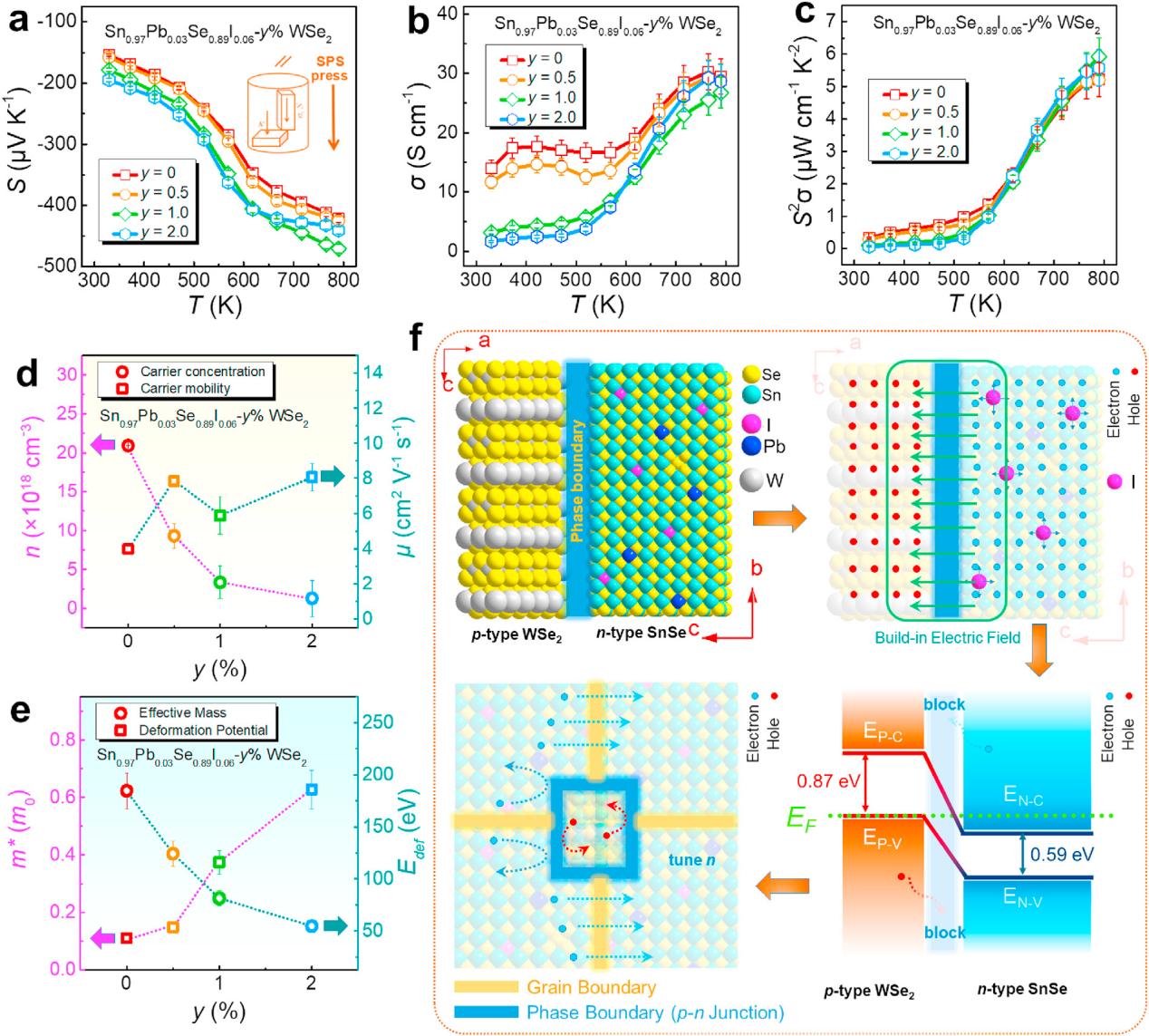 針對n型多晶SnSe熱電性能不高的現狀,本團隊與澳大利亞陳志剛教授合作,首次通過在Pb/I雙摻雜的SnSe基熱電材料中引入二維WSe2 納米顆粒形成WSe2/SnSe p-n 結。這些p-n結作為能量過濾屏障和聲子散射中心大大優化了n型SnSe多晶的熱電性能。成果以“Two-dimensional WSe2/SnSe p-n junctions secure ultrahigh thermoelectric performance in n-type Pb/I Co-doped polycrystalline SnSe”為題發表在國際物理學領域頂級期刊《Materials Today Physics》(JCR物理一區,影響因子:10.44)。陳躍星助理教授為論文第一作者,范平教授和鄭壯豪助理教授為論文通訊作者,深圳大學為第一通訊單位。