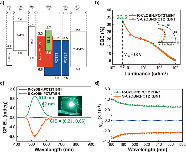 針對上述問題,深圳大學楊楚羅教授課題組提出了一種簡單有效的策略,將手性給體和非手性受體分子進行搭配構筑手性激基復合物作為主體,非手性多重共振-熱活化延遲熒光(MR-TADF)材料作為客體,實現了窄帶發射的高效率圓偏振電致發光,其電致發光的半峰寬(FWHM)為42 nm, 最大外量子效率EQE可達33.2%,電致發光不對稱因子(gEL)為2.8 × 10-3(圖1),是目前報道的窄光譜圓偏振OLED器件的最高效率。該工作通過手性激基復合物主體誘導非手性的客體產生了圓偏振電致發光,為實現高效率和高不對稱因子的圓偏振電致發光提供了一種簡單通用的策略,預期將對CP-OLED器件的發展起到很好的推動作用。