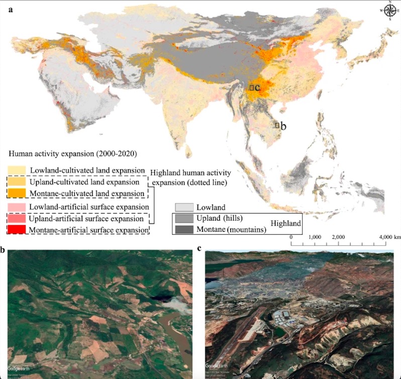 圖1. 亞洲人類活動擴張:(a)人類活動擴張的空間分布(b)耕地向高地擴張(c)人造地表向高地擴張