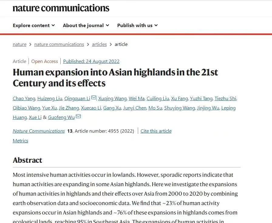 深圳大學李清泉教授團隊及楊超博士在《自然-通訊》(Nature Communications)上發表論文,揭示了21世紀人類活動向亞洲高地上的擴張及其可見影響