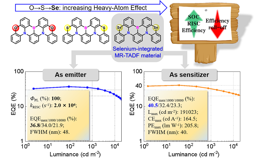 將BNSeSe用作發(fā)光層客體材料制備的蒸鍍型OLED器件外量子效率高達36.8%,其效率滾降得到有效抑制,在1000 cd m-2亮度下外量子效率為34%,即使是在10000 cd m-2亮度下外量子效率仍高達21.9%,媲美銥、鉑等磷光材料器件。此外,他們首次將多重共振型TADF材料用作敏化劑制備了超熒光OLED器件,該器件最大外量子效率為40.5%,在1000 cd m-2亮度下外量子效率為32.4%,即使是在10000 cd m-2亮度下外量子效率仍高達23.3%,最大功率效率超過200 lm W-1,最大亮度接近200000 cd m-2。這一工作為解決MR-TADF電致發(fā)光器件的效率滾降問題提供了新的思路和有效途徑,在高清顯示上具有巨大的應(yīng)用前景。