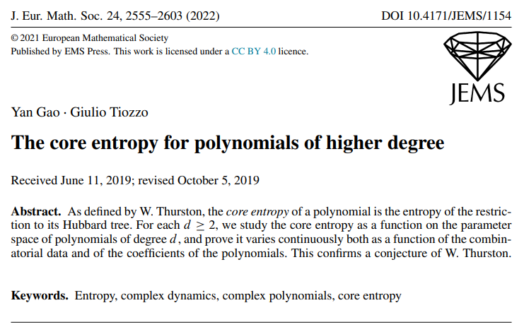 近日,國際知名學術期刊“Journal?of?the?European?Mathematical?Society”(歐洲數學會雜志)正式發表了深圳大學數學與統計學院副教授高延與多倫多大學Tiozzo教授合作的學術論文“The core entropy for polynomials of higher degree”。