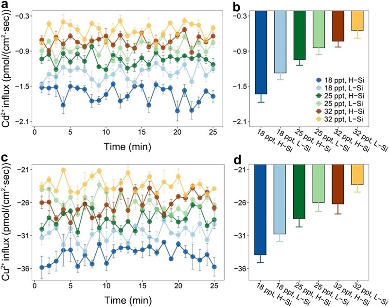 氮磷排放量的增加以及沉積物輸入的減少使硅逐漸成為河口硅藻的限制性營養元素。營養鹽結構的紊亂和鹽度波動可影響河口硅藻對金屬的吸收。然而,目前尚未有研究評估硅濃度和鹽度對硅藻細胞金屬累積的綜合影響。本工作旨在分析鹽度和硅如何共同影響典型硅藻三角褐指藻對金屬的吸附。數據顯示,海水中豐富的硅和低鹽度能增強硅藻表面對鎘和銅的吸附。在單細胞水平上,表面電勢是影響金屬吸附的主要因素,而表面粗糙度也有助于在低鹽度條件下提高細胞表面的金屬負載能力。非損傷微測、原子力顯微鏡、X射線光電子能譜和傅立葉變換紅外光譜等技術表明,硅藻細胞壁中官能團的多樣性和豐度隨鹽度和硅水平而變化,而這主導了細胞表面電勢以及瞬時金屬離子通量。該研究為解釋河口硅藻高度可變的金屬吸附能力提供了新的見解。