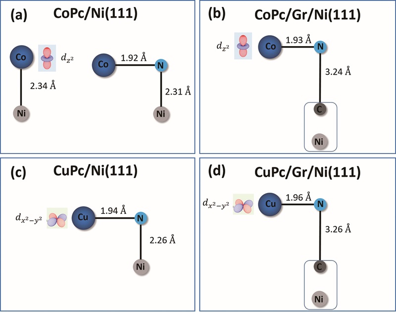 圖1:TMPc/Ni(111)與TMPc/Gr/Ni(111) (TM=Co, Cu)體系中的磁交換相互作用機理示意圖