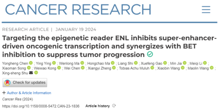 近日,深圳大學醫學部基礎醫學院舒興盛和應穎團隊合作在《Cancer Research》雜志(影響因子11.2,中科院1區TOP,自然指數期刊)上發表了題為“Targeting the epigenetic reader ENL inhibits super-enhancer-driven oncogenic transcription and synergizes with BET inhibition to suppress tumor progression”的研究論文。該工作以結直腸癌為模型刻畫了組蛋白乙酰化閱讀器ENL(eleven-nineteen leukemia)在實體腫瘤中的促癌生物學功能并發現抑制或降解ENL可增敏靶向超增強子(super-enhancer, SE)的表觀遺傳藥物BETi(BET inhibitor),揭示了ENL在控制SE驅動的致癌轉錄中的重要作用,提出通過干預ENL增強腫瘤對BETi敏感性的新策略。舒興盛副教授為該論文通訊作者,醫學部研究生陳永恒,應穎教授、馬文龍副研究員和研究生馬宏超為共同第一作者,深圳大學為第一完成單位。