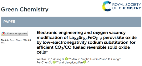 隨著現代社會的快速發展,人類對于能源的需求日益增加,傳統燃料的過度使用造成了大量溫室氣體二氧化碳(CO2)的排放,太陽能、風能等新能源又因為其不穩定性等問題限制著其有效利用。利用新能源的多余電量將CO2轉化為其他可燃類氣體,如一氧化碳或者碳氫燃料氣體,是充分利用新能源和節能減排的有效方案。可逆固體氧化物電池(RSOCs)由于其高效的轉化效率或者有利的熱動力學,受到許多研究工作者的關注并將它們應用在CO2電解/CO氧化中。題為《Electronic engineering and oxygen vacancy modification of La0.6Sr0.4FeO3?δperovskite oxide by low-electronegativity sodium substitution for efficient CO2/CO fueled reversible solid oxide cells》的研究性論文由碩士研究生林萬斌為第一作者,深圳大學范梁棟研究員、西安電子科技大學李一航副教授、新加坡南洋理工大學Pei-Chen Su教授為共同通訊作者合著。深圳大學為第一作者位和第一通訊單位。該論文受邀發表于國際期刊Green Chemistry(影響因子9.80,中科院JCR 1區)上,并被內封面highlight。