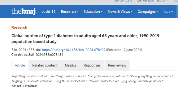 近日,深圳大學(xué)醫(yī)學(xué)部公共衛(wèi)生學(xué)院助理教授張晶在世界四大綜合醫(yī)學(xué)期刊之一的BMJ(中科院1區(qū)TOP,IF=107.7)上發(fā)表了題為《Global burden of type 1 diabetes in adults aged 65 years and older, 1990-2019: population based study》的研究論文。醫(yī)學(xué)部公共衛(wèi)生學(xué)院張晶助理教授為該文章的共同通訊作者。BMJ同期配發(fā)了Editorial。張晶助理教授于BMJ同期受邀發(fā)表了Opinion。