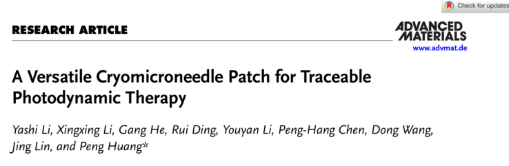 近日,深圳大學醫學部生物醫學工程學院黃鵬特聘教授團隊在國際頂級學術期刊Advanced Materials(影響因子29.4,中科院一區,TOP期刊)上發表了題為《A Versatile Cryomicroneedle Patch for Traceable Photodynamic Therapy》的研究論文。這項研究的所有工作均在深圳大學完成,該團隊研究助理李雅詩、研究生李星星和博士后賀港為論文共同第一作者,黃鵬教授為唯一通訊作者,深圳大學為唯一通訊單位,該團隊所在的生物醫學工程學科屬于廣東省優勢重點學科。