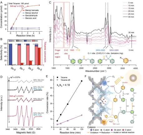 材料表征表明sp2-c-COFs表面的初始接觸角大于130°,引入親水性C≡N-Sb(CN)3位點后,接觸角降低至30°。載流子動力學結(jié)果表明,兩者深電荷捕獲壽命幾乎相同,在有水的情況下Sb5-sp2-c-COFs的淺層捕獲電子主要集中在表面,從而導致電荷載流子壽命大幅延長。此外,Sb-sp2-c-COFs在可極化連續(xù)模型中的ES2和ES3的載流子中心距離大幅提高,說明Sb(CN)3引入使sp2-c-COFs和水更好的發(fā)生相互作用,增加了sp2-c-COFs骨架的極化,從而促進了載流子動力學。機理研究表明,隨著水的引入,Sb5-sp2-c-COFs的DMPO-·O2-峰明顯增強,證實了水與Sb5-sp2-c-COFs之間的強相互作用顯著改善了電荷分離。動力學同位素效應(KIE)實驗顯示kH/kD值為4.18,表明C(sp3)-H鍵活化過程可能是反應的決速步。綜上,該研究工作機理為:Sb5-sp2-c-COFs上的光生電子首先將O2還原為·O2-,光生空穴同時氧化水和甲苯形成·OH (ad)和芐基自由基。隨后,芐基自由基與·O2-反應生成ph-CH2OH,經(jīng)脫水反應轉(zhuǎn)化為苯甲醛。芐基自由基也可直接與·OH(ad)結(jié)合生成苯甲醇。生成的苯甲醇和苯甲醛在Br?nsted酸的催化下反應生成半縮醛,半縮醛在溶液中被ORR相關(guān)的活性氧進一步氧化生成酯。