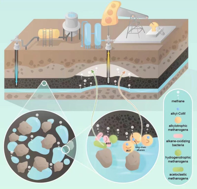 近日,深圳大學(xué)高等研究院教授李猛和張翠景研究員團(tuán)隊(duì)聯(lián)合農(nóng)業(yè)農(nóng)村部成都沼氣科學(xué)研究所厭氧微生物團(tuán)隊(duì)在The ISME Journal上發(fā)表了題為“Anaerobic hydrocarbon biodegradation by alkylotrophic methanogens in deep oil reservoirs”的研究論文,發(fā)現(xiàn)烷基營(yíng)養(yǎng)型產(chǎn)甲烷古菌在我國(guó)油藏中廣泛分布,并且在儲(chǔ)層原油的降解中起著關(guān)鍵作用(圖1)。高等研究院教授李猛和厭氧微生物創(chuàng)新團(tuán)隊(duì)研究員承磊為共同通訊作者,高等研究院研究員張翠景和農(nóng)業(yè)農(nóng)村部成都沼氣科學(xué)研究所2022級(jí)博士研究生周卓、副研究員茶桂宏為共同第一作者。