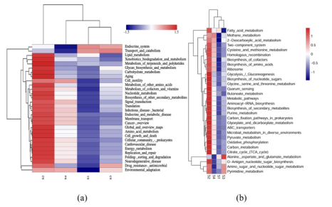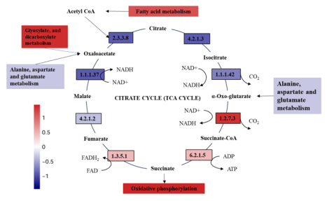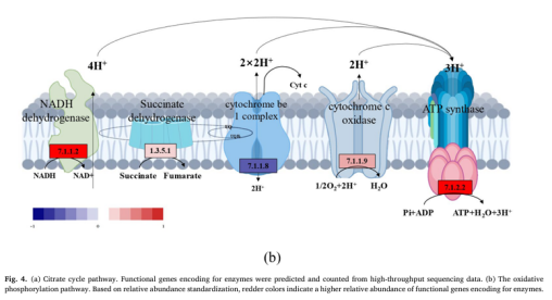 為了理解低電壓電場導(dǎo)致E-AnMBR中生物膜變厚這一過程所涉及的機制,我們利用宏基因組技術(shù)檢測了非電活性細(xì)菌群落的功能基因豐度,從而繪制了群落中的元代謝網(wǎng)絡(luò)圖。通過宏基因組分析,從基因水平鑒定了非電活性細(xì)菌在電場作用下的代謝途徑譜圖。功能分析基于KEGG數(shù)據(jù)庫對高豐度代謝途徑酶的編碼基因進行了標(biāo)記(圖3)。與S4相比,與非電活性細(xì)菌生長相關(guān)的各種有機物的生物合成和代謝基因(即碳水化合物代謝、脂質(zhì)代謝和氨基酸代謝)在S2中總體呈上升趨勢(圖3c),而S1和S3總體呈下降趨勢(圖3a)。這一結(jié)果表明,電場刺激了非電活性細(xì)菌的代謝能力。與S4相比,S2的群體感應(yīng)(QS)基因比SI和S3的要豐富得多(圖3b)。QS基因的增加可能有助于細(xì)菌之間的信息交換和非電活性細(xì)菌的生物膜形成(Sun et al. 2018)。電場還可以干擾微生物群落中的信號通路和通訊機制,包括群體感應(yīng),這對生物膜的形成非常重要(Zhou et al. 202b)。氨基酸旺盛的代謝活性(即Glyoxylate和dicarboxylate, Pyruvate,Glycine serine和蘇氨酸)進一步證實了這一點(圖3a)。基于功能基因預(yù)測分析,電場調(diào)節(jié)碳代謝影響NADH再生和氧化磷酸化編碼脂肪酸代謝途徑酶的功能基因的增加表明有可能有更多的乙酰輔酶a被燃料注入檸檬酸循環(huán)(圖4a)。檸檬酸循環(huán)途徑中編碼琥珀酸脫氫酶1.3.5.1、琥珀酸- coa合成酶(6.2.1.5)和2-0xoglutarate reductase[1.2.7.3]的功能基因的高豐度也證實了這一點(圖4a)。同時,琥珀酸脫氫酶[1.3.5.1]和2-氧戊二酸還原酶[1.2.7.3]編碼的功能基因豐度高,表明會產(chǎn)生更多的氧化磷酸化底物FADH2和NADH。因此,加快了氧化磷酸化的電子傳遞速度。這表明FADH2和NADH積累,促進了氧化磷酸化過程中的電子轉(zhuǎn)移。事實上,編碼氧化磷酸化途徑酶的功能基因明顯增加(圖4b),類似于大多數(shù)其他編碼參與檸檬酸循環(huán)的酶的基因(圖4a)。總體而言,電場(0.5 V)通過調(diào)節(jié)碳代謝影響NADH再生和氧化磷酸化,顯著影響非電活性細(xì)菌的生物膜形成。3.5. 電場與非電活性細(xì)菌代謝途徑的相互作用關(guān)系代謝途徑功能基因、固碳基因、碳代謝基因、TCA循環(huán)基因、群體感應(yīng)基因具有較高的相關(guān)系數(shù)(圖5)。它們的最低相關(guān)系數(shù)為0.80。說明編碼酶的代謝途徑基因增加,編碼酶的QS基因也會增加。因此,在anmbr中,非電活性細(xì)菌是通過電場控制生物膜的關(guān)鍵貢獻者。