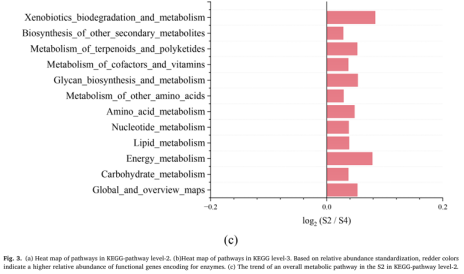 通過SEM觀察非電活性菌的生物膜形成情況,生物膜厚度在350 ~ 800 μm之間(圖S7)。與S4中的生物膜(468 μm)相比,發(fā)現(xiàn)過低(0.3 V)和過高(1 V)的電場電壓都阻礙了非電活性細(xì)菌在膜表面的生物膜生長。0.5 V電場(S2)顯著提高了非電活性細(xì)菌的生物膜厚度(780 um),達到S4的1.6倍。此外,S2 (0.5 V)較高的zeta電位絕對值(31.6 mV, p < 0.01)也進一步支持了這一點(圖S8)。由此可見,電場顯著調(diào)節(jié)非電活性細(xì)菌生物膜的發(fā)育,而0.5 V電場則明顯刺激非電活性細(xì)菌在膜表面的形成。進一步的研究發(fā)現(xiàn),較低的PN/PS被認(rèn)為增加了非電活性細(xì)菌在膜上不可逆的生物膜形成。從圖2(a)和(b)可以直觀地看出,PN/PS值為S1 (1 V)> S3 (0.3 V)> 54 (0 V)> S2 (0.5 V),S3 (0.3 V)和S1 (1 V)使PN/PS值高于S4,而S2 (0.5 V)使其降低。這一結(jié)果與S2的生物膜最厚的觀察結(jié)果相一致。在0.5 V電場作用下,核酸最高(26.8 mg/g VsS, p < 0.01)。同時,S2的生物膜越厚,其核酸含量也可能越高。這一結(jié)果解釋了為什么0.5 V電場會加劇由于非電活性細(xì)菌生物膜在膜表面形成的不可逆性污染。此外,S2的高脫氫酶活性(DHA)含量(9.36 mg/g VSS, p < 0.01)也支持了這一結(jié)論(圖d)。在生物處理過程中,高DHA產(chǎn)生更多的代謝廢物,從而導(dǎo)致非電活性細(xì)菌形成更嚴(yán)重的生物膜。與S4相比,S2的DHA含量增加,而S3和S1的DHA含量則受到抑制。因此,0.5 V電場可以促進非電活性細(xì)菌的生物膜形成,并積聚在膜表面。