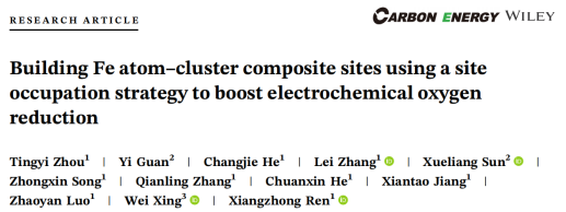 深圳大學化學與環境工程學院任祥忠教授團隊在材料領域頂尖期刊《Carbon Energy》(影響因子19.5,中科院JCR 1區)發表了題為《Building Fe atom-cluster composite sites using a site occupation strategy to boost electrochemical oxygen reduction》的研究論文。該團隊碩士研究生周廷儀為論文第一作者,深圳大學任祥忠教授和羅兆艷助理教授,中國科學院長春應化所邢巍教授為該論文共同通訊作者,深圳大學為第一作者單位和第一通訊單位。