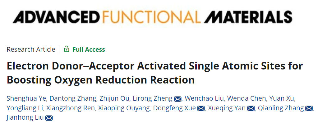 2、深圳大學張黔玲教授團隊在期刊Advanced Functional Materials上發表題為“Electron Donor–Acceptor Activated Single Atomic Sites for Boosting Oxygen Reduction Reaction”的研究論文,深圳大學葉盛華研究員、中國科學院深圳先進技術研究院張丹彤博士是共同第一作者,深圳大學劉劍洪和張黔玲教授、北京大學顏學慶教授、電子科技大學(深圳)高等研究院薛冬峰教授以及中科院高能物理研究所鄭黎榮研究員為共同通訊作者。