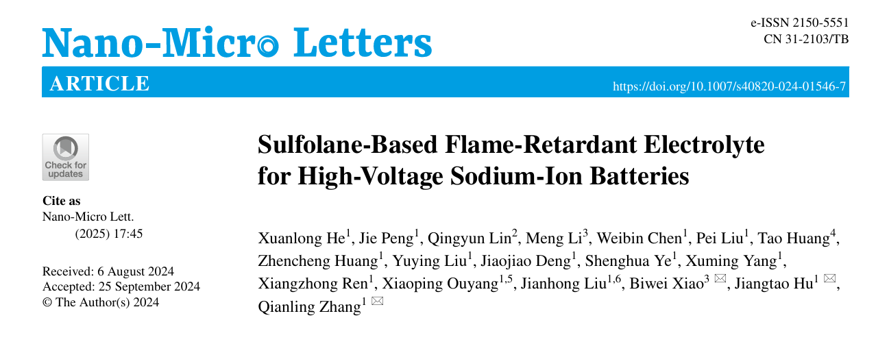 3. 深圳大學化學與環境工程學院張黔玲教授團隊在材料領域頂尖期刊Nano-Micro Letters(影響因子31.6,中科院JCR 1區,TOP期刊)發表了題為“Sulfolane?Based Flame?Retardant Electrolyte for High?Voltage Sodium?Ion Batteries”的研究論文。該團隊碩士生何鉉龍為論文第一作者,深圳大學張黔玲教授、胡江濤副教授、有研(廣東)新材料技術研究院肖必威教授為該論文共同通訊作者,深圳大學為第一作者單位和第一通訊單位。