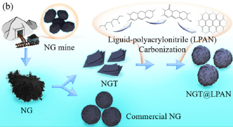 在該項工作中,開發了一種獨特的多功能液態聚丙烯腈(LPAN)作為碳源,用于天然石墨(NGT)的回收。利于LPAN聚合物的多官能團結構,在一次NGT顆粒表面形成一層致密的包覆層,對碳化后的缺陷進行表面改性和修復,構建出具有低表面積/高振實密度的二次石墨顆粒。該材料在首次放電比容量(400.33mAh/g)和半電池庫倫效率(92.07%)上表現出優異的電化學性能。與NMC532(Ni:Mn:Co = 5:3:2)陰極組裝全電池表現出優異的循環性能,在1C電流密度下循環500圈,其容量保持率為84.32%。