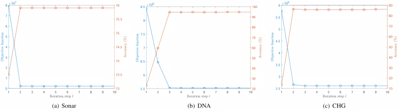 圖2. ODSVM的收斂性與識(shí)別率變化情況。在不同的二分類、多分類任務(wù)中,ODSVM模型的目標(biāo)函數(shù)值能快速單調(diào)下降且收斂,分類準(zhǔn)確率呈迅速上升并逼近最高精度。