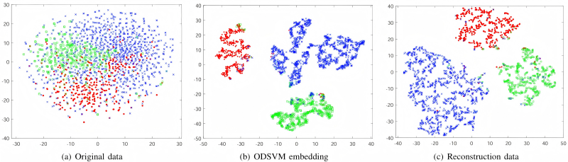 圖1.可視化ODSVM學(xué)習(xí)到的特征,不同顏色表示不同類別的數(shù)據(jù),可見其性能之優(yōu)異。