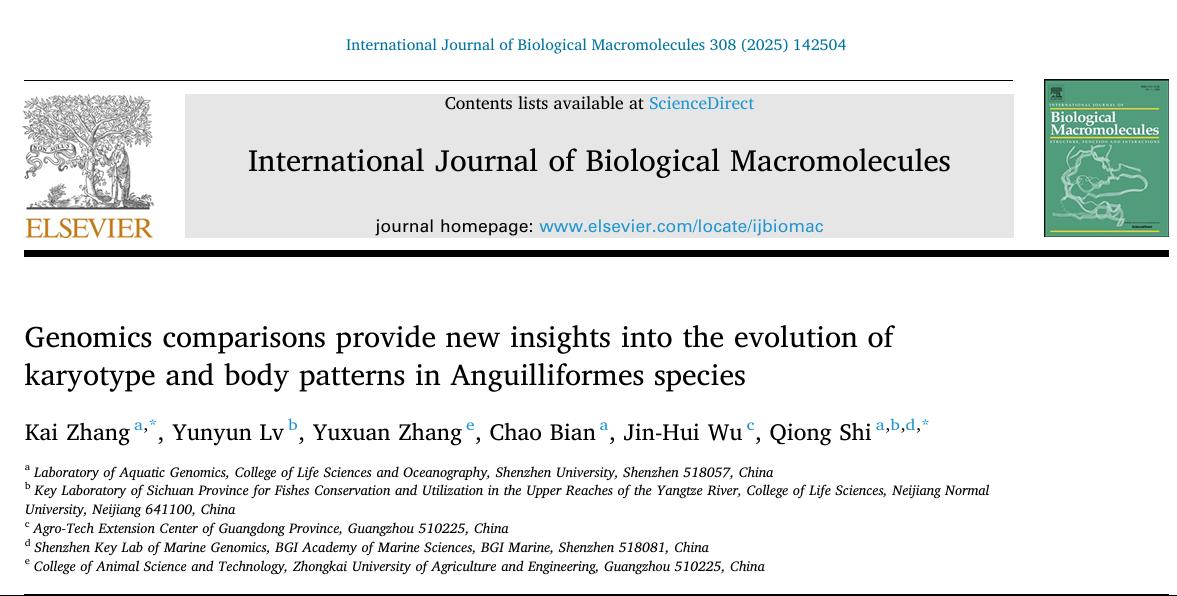 近日,深圳大學生命與海洋科學學院石瓊特聘教授團隊在生物學top期刊International Journal of Biological Macromolecules(影響因子7.7)上發表題為“Genomics comparisons provide new insights into the evolution of karyotype and body patterns in Anguilliformes species”的研究論文。